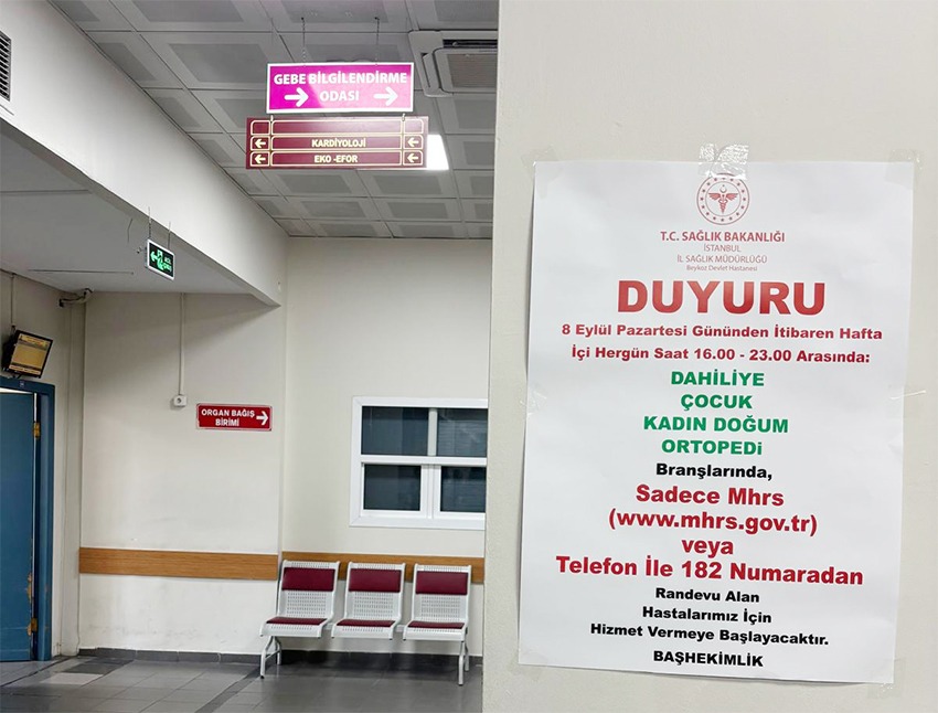 Beykoz Devlet Hastanesi’nin birçok hizmet alanında asılan afişlerde, Beykoz Devlet Hastanesi’nde 8 Eylül 2025 Pazartesi günü itibari ile akşam polikliniklerinin hizmet vermeye başlayacağı ilan edildi.