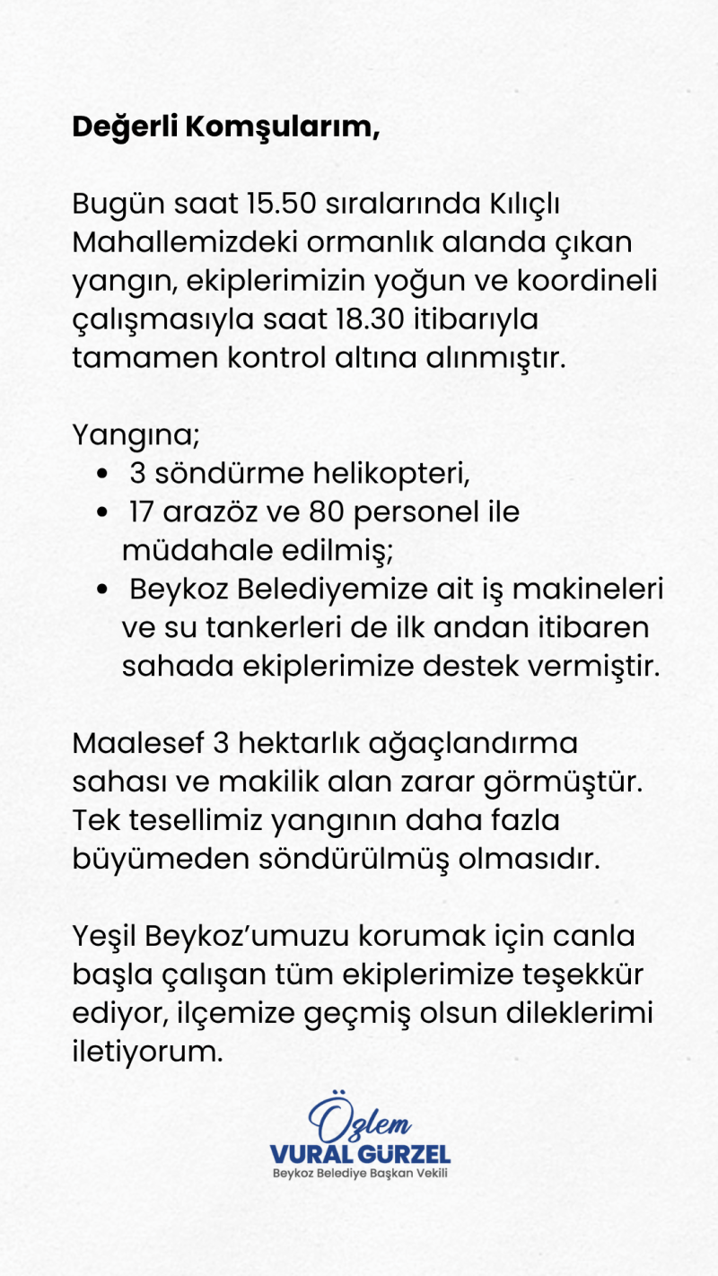 Beykoz Belediye Başkan Vekili Özlem Vural Gürzel yaptığı açıklamada, yangına hızlı ve koordineli şekilde müdahale edildiğini belirterek, sahada görev alan tüm ekiplere teşekkür etti.